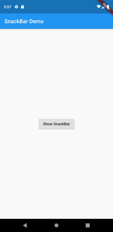 SnackBarDemo 스크린에서는 화면 중앙에 RaisedButton을 추가하고 있으며 버튼이 눌리면 스낵바가 출력되는 구조다.