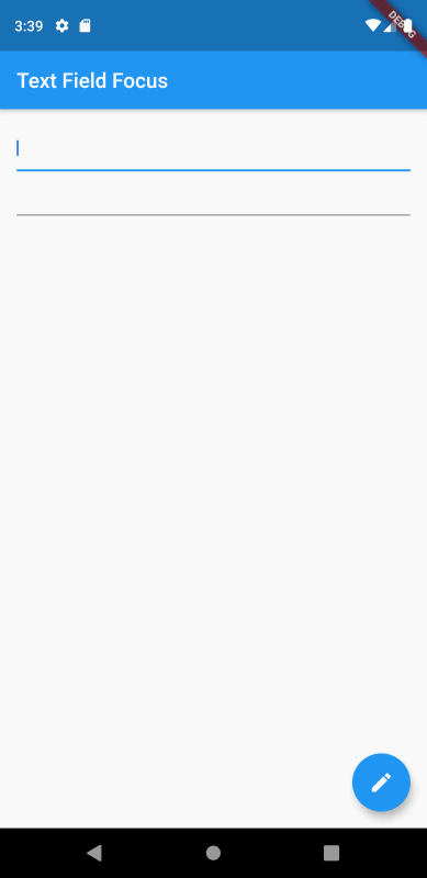 앱이 실행되면 첫번째 텍스트필드에 자동으로 포커스가 전달된다. 그리고 화면 우측하단의 버튼을 클릭하면 두번째 텍스트 필드로 포커스가 전달되는 것을 확인할 수 있다.