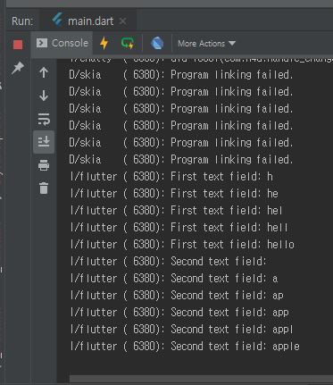 다시 설명하면, 텍스트필드를 제어하는 TextEditngController의 인스턴스에 텍스트를 콘솔에 출력하는 메소를 리스너로 등록하고 그 인스턴스를 텍스트필드의 controller 항목에 설정하며 해당 텍스트필드의 값이 변경될 때마다 리스너가 호출되게 된다.