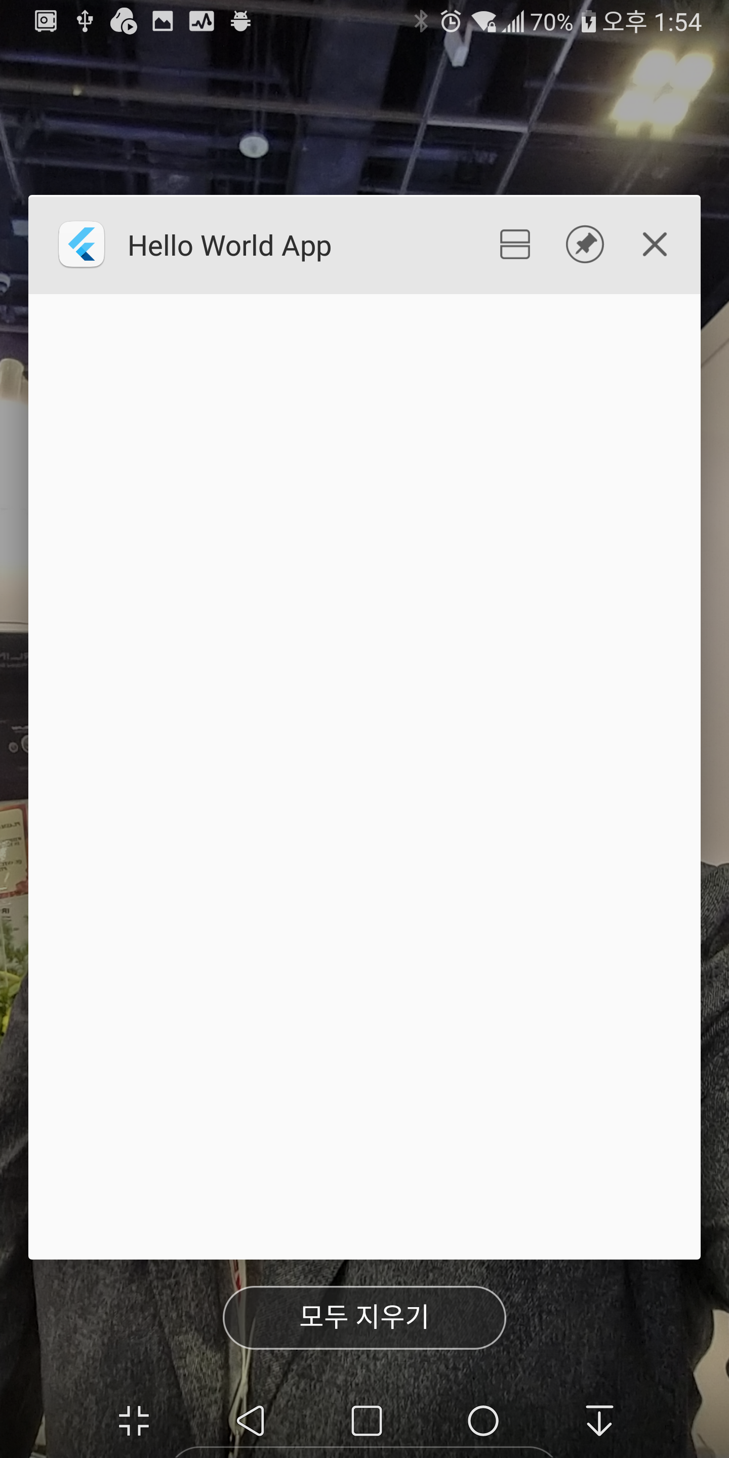 다음으로 현재 실행중인 앱의 목록을 확인하면 다음과 같이 MaterialApp의 title로 설정한 문구(Hello World App)가 출력되는 것을 확인할 수 있다. 세번째 Hello World 출력에 성공했다.