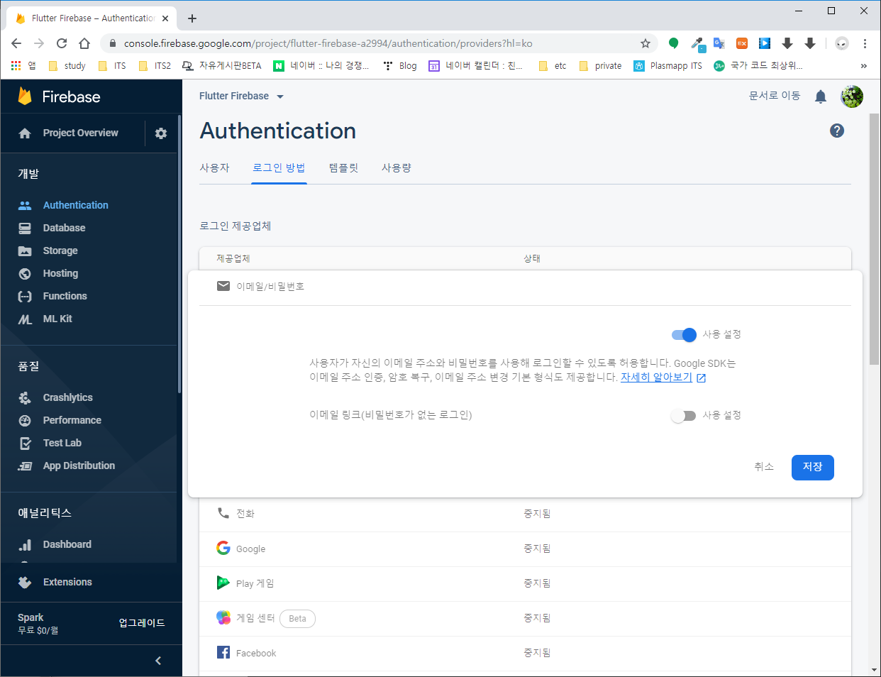 이메일/비밀번호 항목을 선택하여 사용 설정을 선택한 후 저장버튼을 클릭한다.