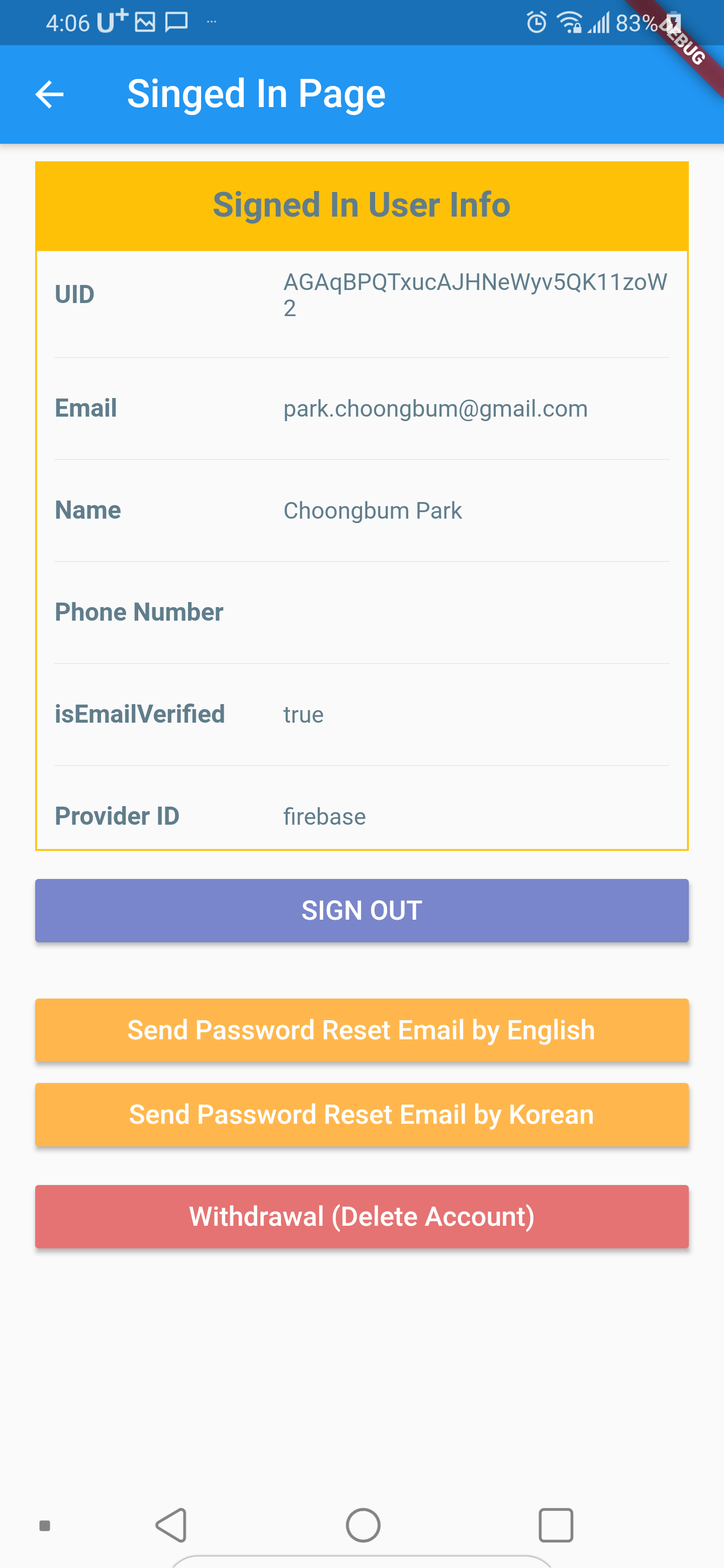 기존에 이메일/패스워드로 로그인했을때와의 차이점은 Name 항목에 이름값이 출력된다는 것이다. 이 이름은 구글 계정으로부터 획득된 값이다.