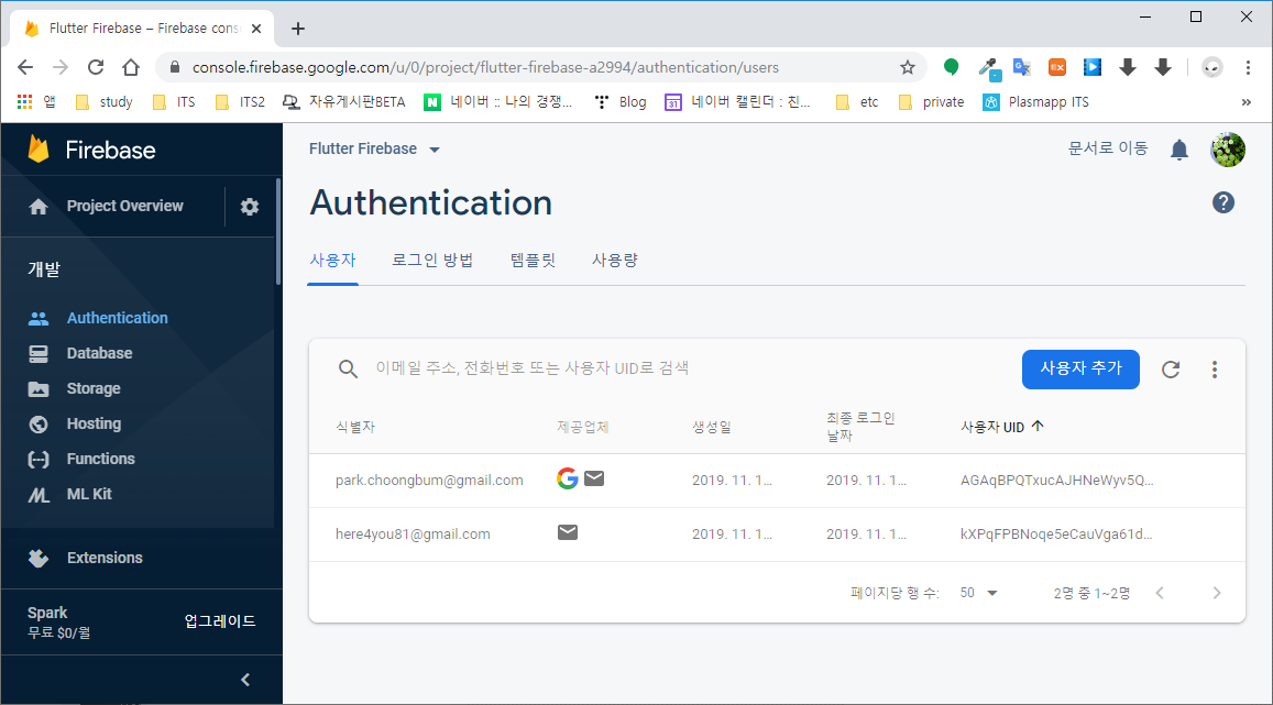 우선 Firebase 콘솔의 사용자 항목을 확인하자. 지난 강좌에서 등록했던 사용자 정보만에 출력되고 있다.
