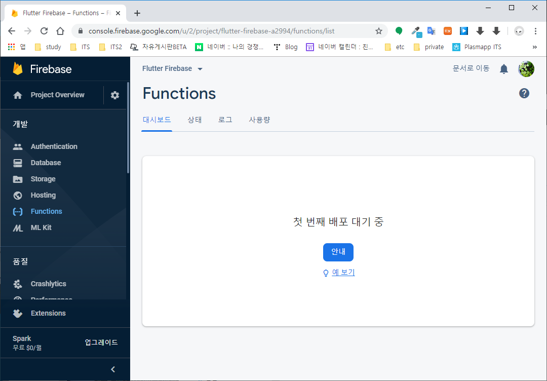 Firebase 콘솔에 접속하여 Flutter Firebase 프로젝트로 진입한 후 Functions 메뉴로 진입한다.