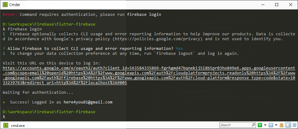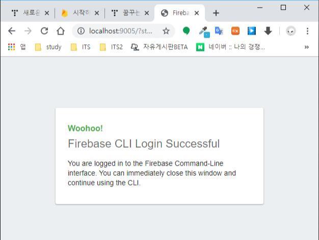 연결을 허용하면 Firebase CLI에 로그인이 성공되었다는 메시지가 출력된다.