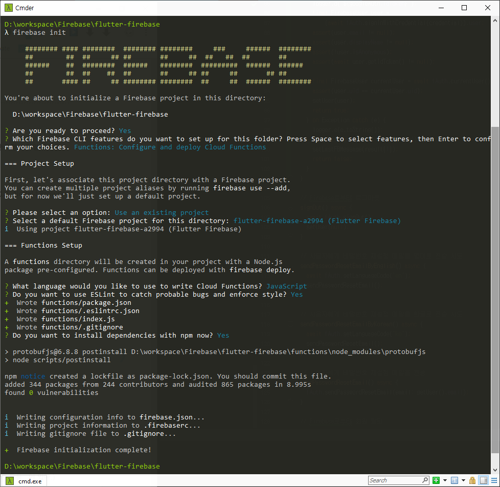 Firebase 툴은 프로젝트 생성을 위해 몇 가지는 물어본다.
