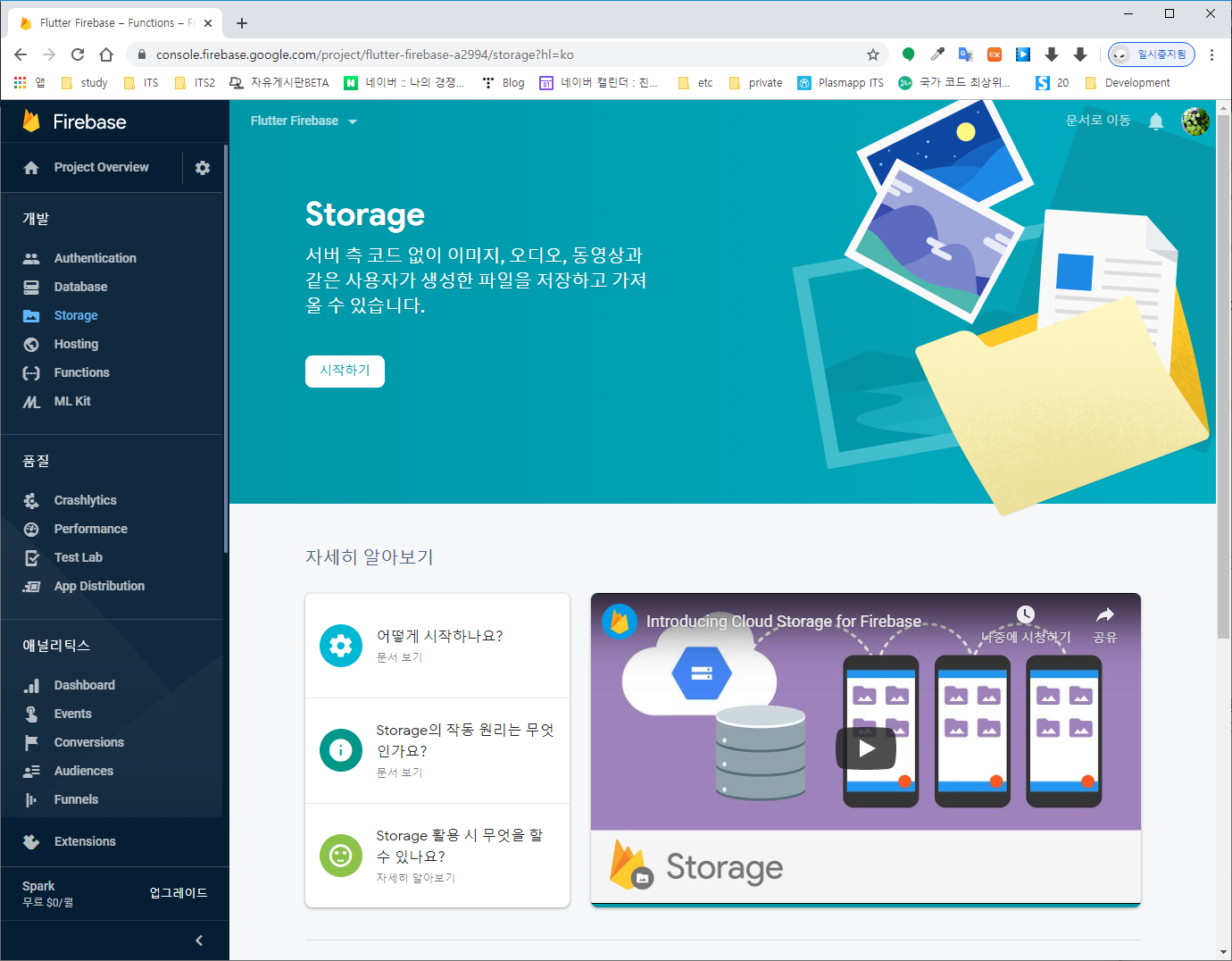Firebase 콘솔에 진입하여 Storage 메뉴에서 시작하기를 선택한다.