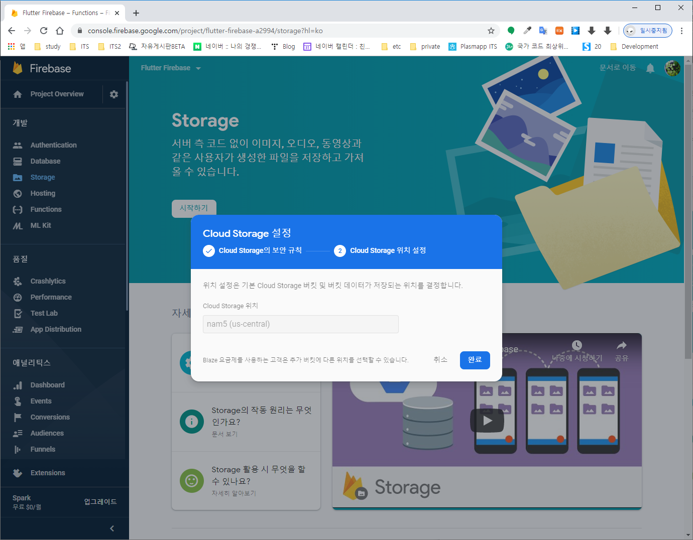 다음으로 이용할 Storage의 위치 설정 화면이 나타난다. 기존에 Firestore를 설정하면서 지정된 위치를 이용하게 된다. 완료를 선택한다.