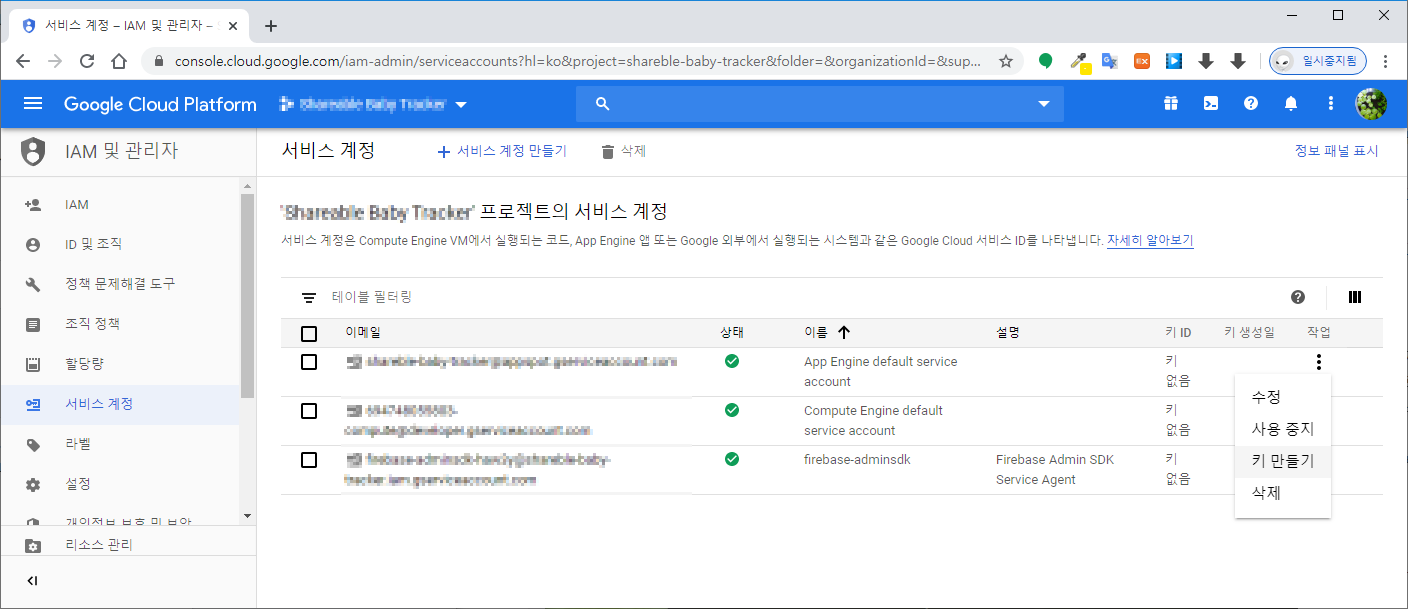 구글 클라우드 콘솔에 로그인 한 후 IAM 및 관리자의 서비스 계정 항목으로 이동하자. App Engine default service account 항목의 작업을 클릭해서 키 만들기를 선택한다.