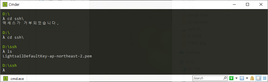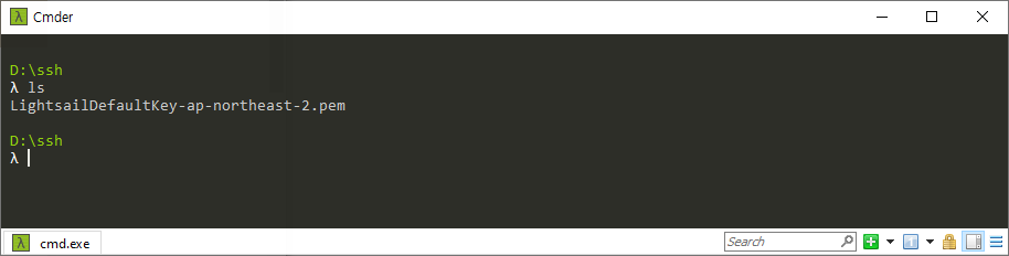 LightsailDefaultKey-ap-northeast-2.pem 이란 이름으로 다운로드 된다. 적당한 위치로 복사한 후 커맨트창을 열어 해당 위치로 이동한다.