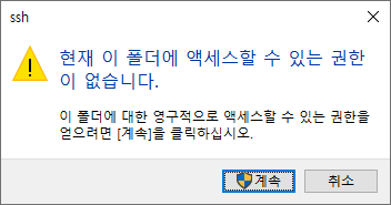 ssh 폴더로 집입하려고 하면 액세스할 권한이 없다는 문구가 나온다. 계속(관리자계정)을 선택해서 진입한다.