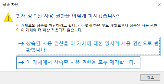 하단의 이 개체에서 상속된 사용 권한을 모두 제거합니다. 를 선택한 후 적용 후 확인을 선택한다.