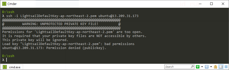 헐. SSH 키 파일의 접근 권한 오류가 발생한다. 윈도우서 만나니 당황스럽다.