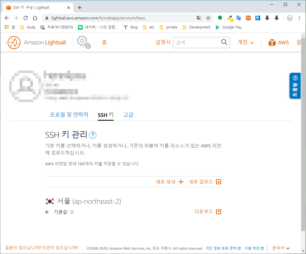 SSH 키 황목에서 보면 서울 리전의 기본 SSH 키를 다운로드할 수 있다. 다운로드 하자.