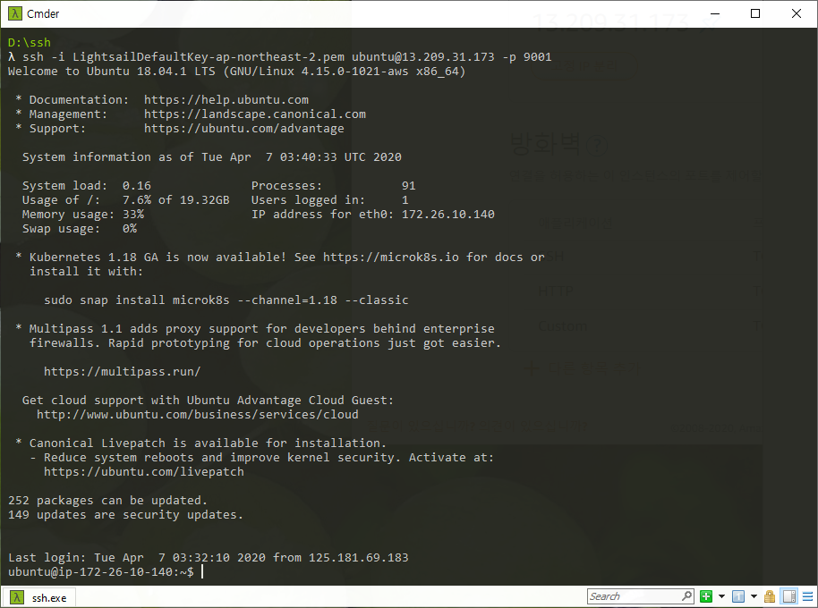 $> ssh -i LightsailDefaultKey-ap-northeast-2.pem ubuntu@13.209.31.173 -p 9001