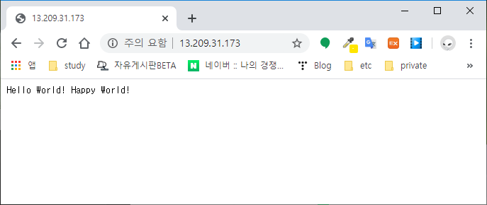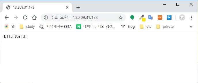 웹브라우저틀 통해 인스턴스로 접속해보자. 정상 동작중임을 확인할 수 있다.