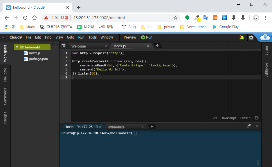 이제 소스코드(index.js)를 편집할 차례이다. 지난 강좌에서 설치한 Cloud9을 실행해서 접속하자.
