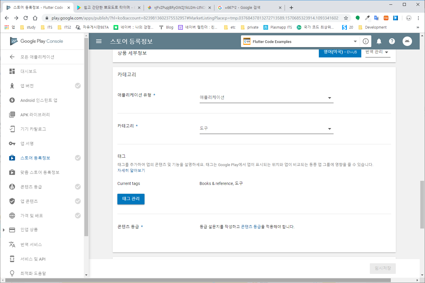 카테고리 항목을 설정한다. 콘텐츠 등급은 APK 파일을 업로드한 후에 설정할 수 있으므로 이번에는 생락한다.