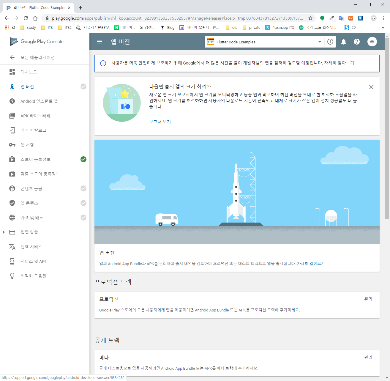 다음으로 콘텐츠 등급, 앱콘텐츠, 가격 및 배포 메뉴에서 배포할 앱의 목적에 맞게 설정을 한 후 앱 버전의 프로덕션 메뉴로 진입하여 프로덕션 출시 시작을 선택하여 앱을 출시한다.