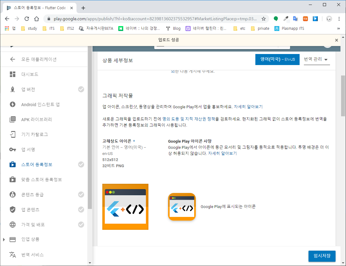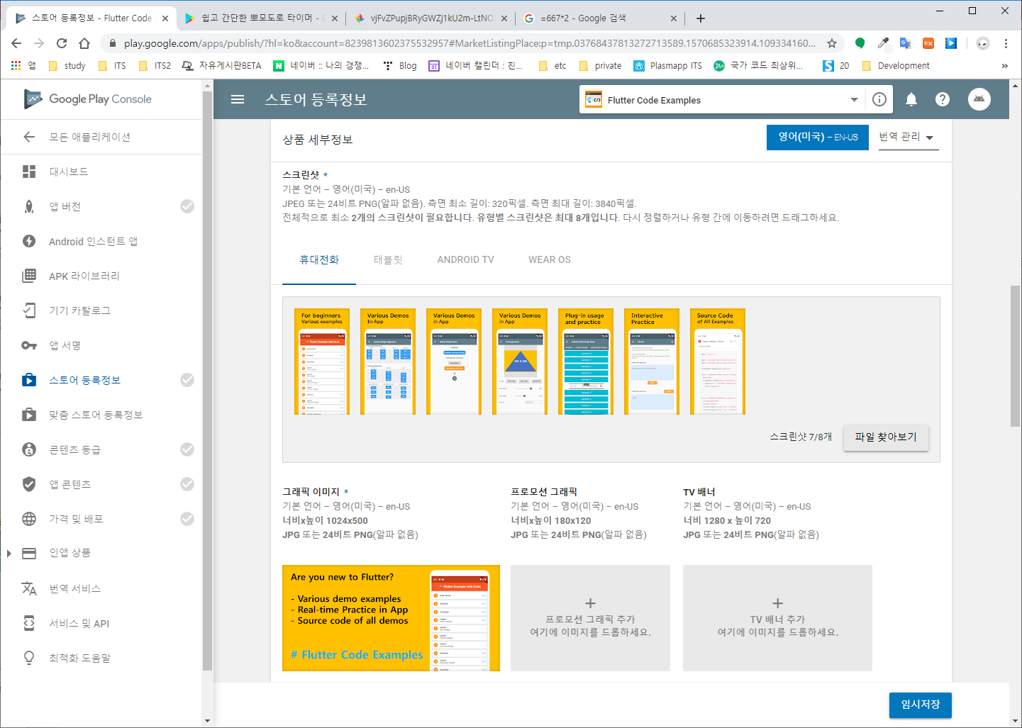 스크린샷 항목과 그래픽 이미지 항목에 규격에 맞는 이미지들을 업로드한다.