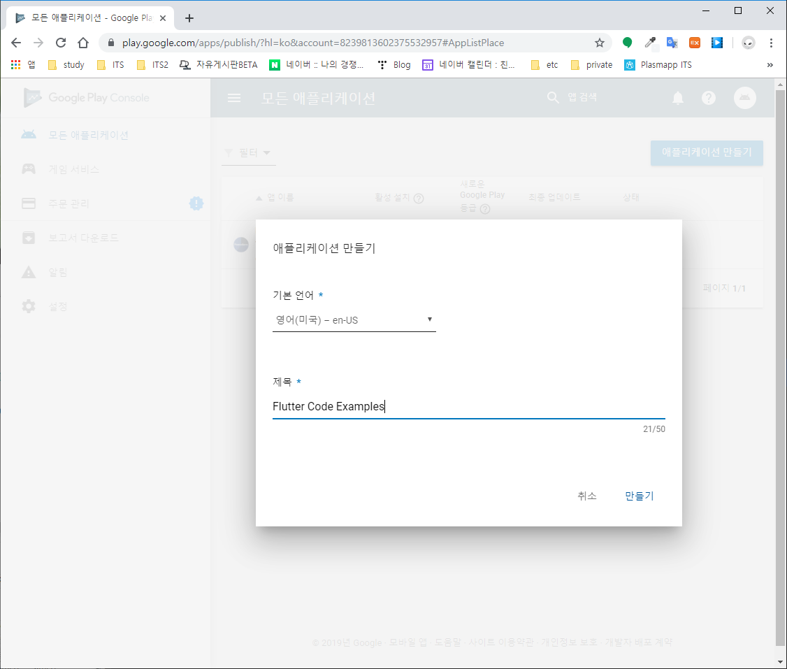 애플리케이션 만들기에서 기본 언어와 앱의 이름을 등록한다. 만약 글로벌 앱으로 출시하려면 기본 언어를 영어로 선택한다. 한국어를 포한하여 다른 언어도 추가로 등록할 수 있다.
